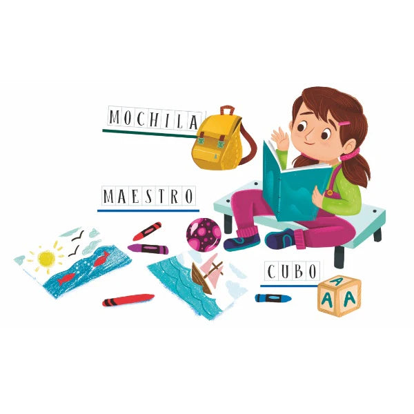 Un sencillo y entretenido juego educativo que enseña a los niños sus primeras palabras. Cuando se unen, sus 12 fichas presentan 2 ambientes habituales: una casa en una cara y una escuela en la otra. Los niños aprenderán a asociar 24 elementos familiares con sus correspondientes nombres.
